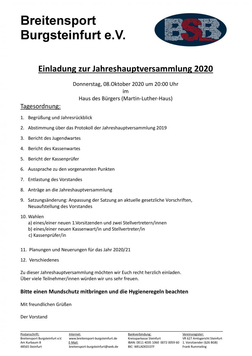 Am vergangenen Donnerstag traf sich der Breitensport Burgsteinfurt im Martin-Luther Haus zu der durch Corona verschobenen Jahreshauptversammlung 2020. Nach einem Rückblick des Jahres 2019 wurden die Berichte des Jugendwartes, des Kassenwartes und der beiden Kassenprüfer vorgetragen. Im Anschluss wurde der Vorstand für das Jahr 2019, in dem es einen leichten Mitgliederzuwachs gab, erfolgreich entlastet.
