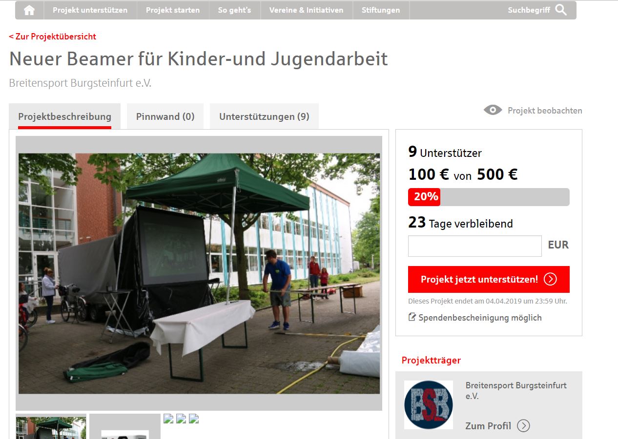 Wir benötigen einen neuen Beamer für die Kinder und Jugendarbeit sowie für die Aus-und Fortbildung unserer Mitarbeiter. Dafür bitten wir unsere Mitglieder und Freunde des BSB um Unterstützung. Das Projekt wird von der Sparkasse ab einer Spenderzahl von 21 Spendern, die mindestens 10,- € Spenden, mit 500,- € unterstützt. Diese Unterstützung möchten wir gerne erreichen.