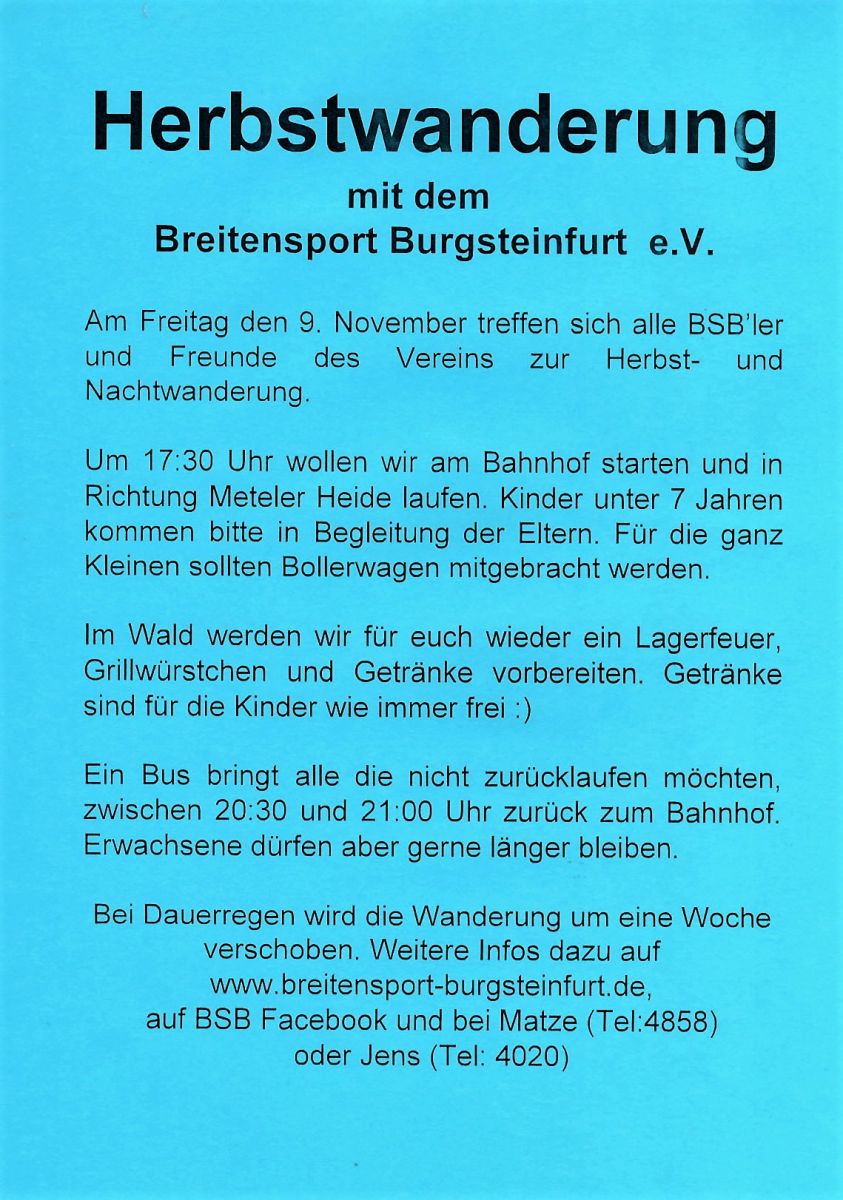 am Freitag wollen wir wieder unsere Herbstwanderung machen zu der ihr herzlich eingeladen seid. Gerne dürft ihr Freunde mitbringen (das werde ich jedes Jahr auf´s neue gefragt), für Würstchen und Getränke wird gesorgt, der Bus für den Rückweg ist bestellt ... ihr müsst "nur" kommen!