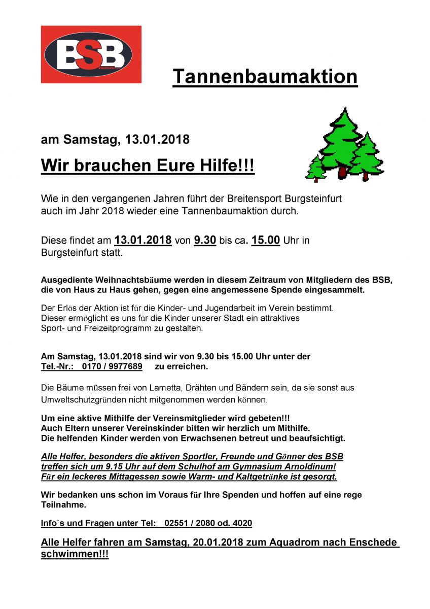 Am Samstag den 13.01.18 war es wieder soweit. Der Breitensport Burgsteinfurt traf sich am Gymnasium Arnoldinum um die Tannenbäume in Burgsteinfurt einzusammeln. Nachdem es eine kurze Information zum Tagesablauf gab und sich die insgesamt über130 Helfer in Gruppen aufgeteilt hatten, ging es dann los in die jeweiligen Gebiete zum Sammeln. Schon einige Tage vorher hatte das Orgateam die Stadt in 17 verschiedene Bezirke eingeteilt, Karten erstellt, Gespanne zusammengestellt und Fahrer organisiert. Als kleine Stärkung gab es, vom eingespielten Küchenteam bestens vorbereitet, für alle Helfer zum Mittagessen die geliebten Spaghetti Bolognese. Gegen 15.00 Uhr waren dann alle Bäume in Burgsteinfurt dank der zahlreichen Unterstützung eingesammelt. Das Orga und Abladeteam bei Rolinck hatte alle Hände voll zu tun. Den ganzen Tag über klingelte das Telefon und im Minutentakt lieferten die 17 eingesetzten Gespanne einige tausend Bäume an. Ein besonderer Dank gilt allen Helfern und der verständnisvollen und meist sehr netten Bevölkerung für die geleisteten Spenden und natürlich einigen Steinfurter Firmen, welche mit Fahrzeugen und Anhängern unterstützten. Dank auch an die Brauerei Rolinck, auf deren Gelände die Bäume für das große Osterfeuer des Heimatvereins gesammelt werden. Die erwachsenen Helfer trafen sich zum gemütlichen Ausklang des arbeitsreichen Tages zum Neujahrskuchen-Backen in Willi`s Hütte. Für die Kinder und Jugendlichen geht es am nächsten Samstag nach Enschede ins Aquadrom zum Schwimmen.