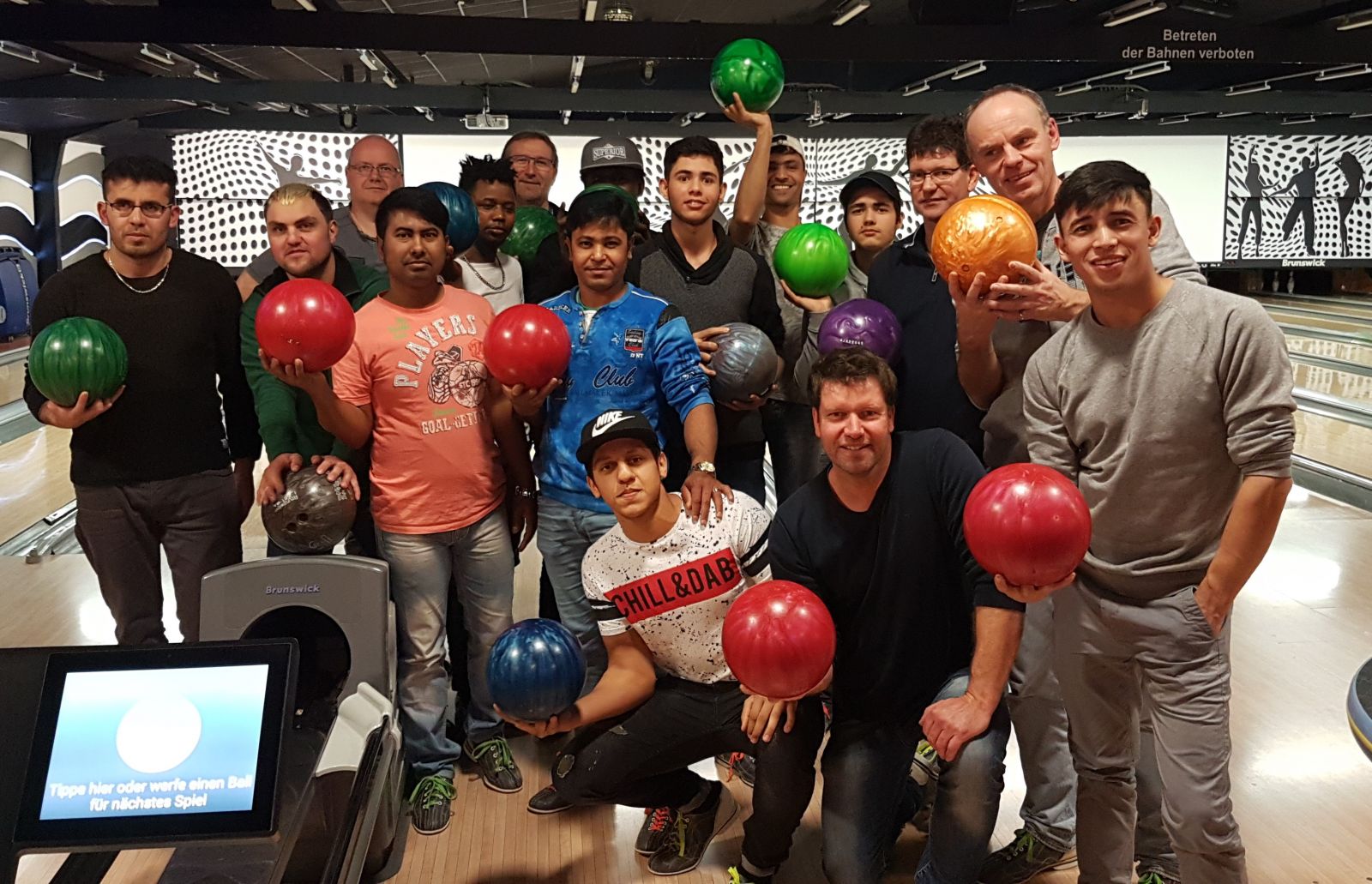 Ne ruhige Kugel schieben, das ist doch nix für BSB´ler! Ne wilde Kugel, in diesem Fall eine Bowlingkugel, schoben unsere Mittwoch-Sportler und die Cricket Gruppe am vergangenen Donnerstag gemeinsam zum Jahresabschluss im Bowling Center Münster. Durch eine Spende der Stadtwerke Steinfurt konnte diese Unternehmung noch kurzfristig durchgeführt werden. Sie sollte ein Dankeschön für die Mittwoch-Sportler als die Gruppe mit den meisten "Flüchtlingen"sein, wobei dieser Begriff nicht mehr zu trifft, so sind diese doch inzwischen fest in Steinfurt angekommen. Die neue BSB Cricket Gruppe hatte es sich redlich verdient, mit ihrem Leiter Eidagul Paktiawal waren sie im vergangenen Jahr bei fast allen Aktionen des BSB tatkräftig unterstützend dabei. So wurden die Kugeln mit viel Elan und Spaß auf die Kegel (Pin´s) gerollt, man wurde von Wurf zu Wurf besser und so mancher Strike (alle zehn Pin´s beim ersten Wurf abgeräumt) wurde bejubelt und beklatscht.