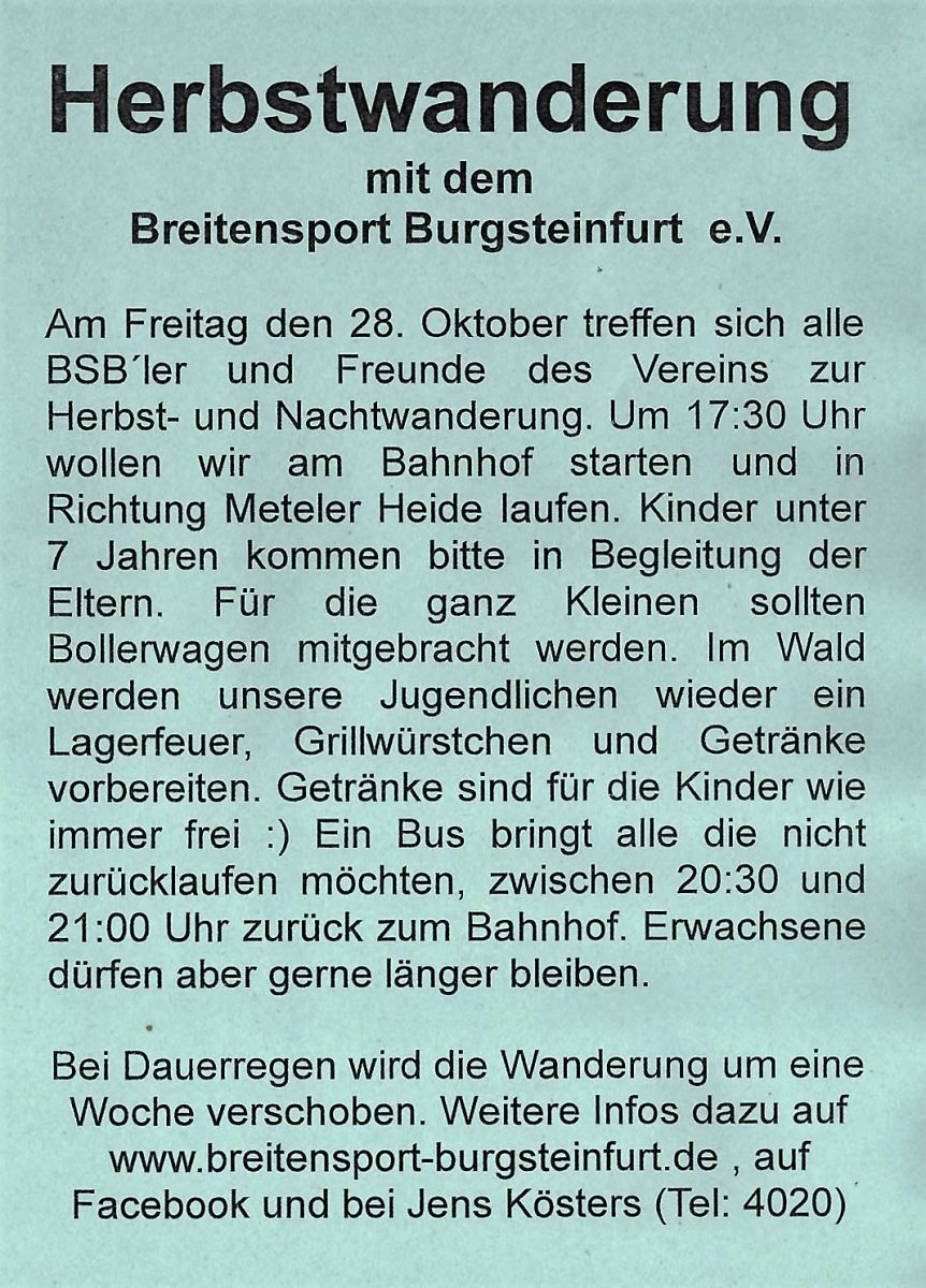 am kommenden Freitag ist es schon wieder soweit, die Herbstwanderung liegt an. Um 17:30 Uhr geht es am Bahnhof in Burgsteinfurt los und in diesem Jahr kommt auch der Bus ... der uns vom Schützenplatz der Sellen-Veltruper zurück zum Bahnhof bringt (alle die letztes Jahr dabei waren wissen was ich meine). Über viele Teilnehmer würden wir uns genauso freuen wie über gutes Wanderwetter! Also hoch den Hintern und wir sehen uns spätestens am Freitag in der Meteler Heide.