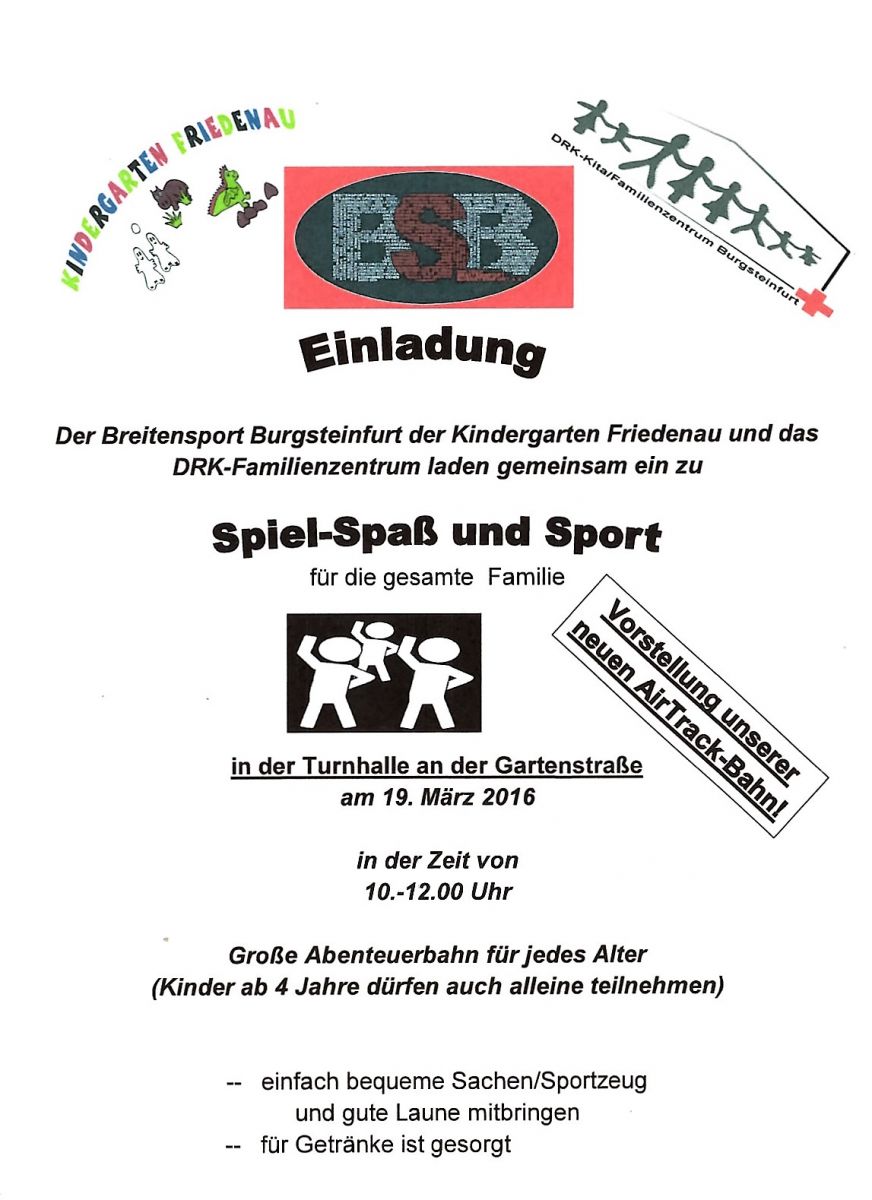 am Samstag wollen wir in unserer Sporthalle an der Gartenstraße auf der ganz großen Abenteuerbahn mit euch toben! Alles was wir haben soll aufgebaut werden! Eure Eltern dürft ihr mitbringen. Für die gibt es Kaffee oder Tee, für euch haben wir auch was zu trinken dabei. Natürlich könnt ihr eure Freunde mitbringen, auch wenn die nicht im BSB sind.