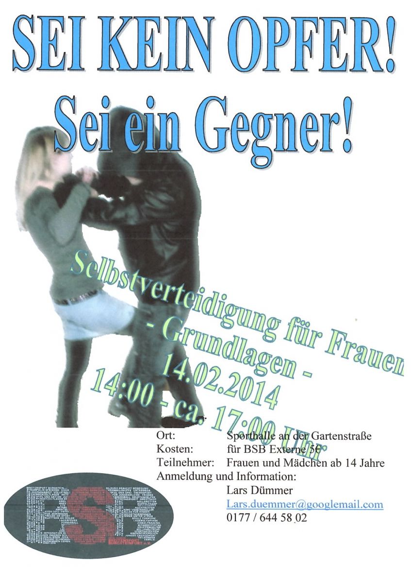 am 14.Februar bietet Lars (aus unserer KungFu Truppe) einen Nachmittag für Mädchen (ab14 Jahren) und Frauen an, die sich in Sachen Selbstbehauptung und Selbstverteidigung ausbilden lassen wollen.