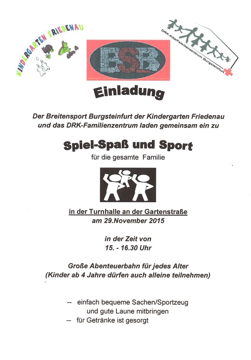 Die Spiel-Spaß-Sport Aktion wird von Samstag auf Sonntag (29.11.15) verschoben. Auch die Uhrzeit hat sich geändert, von 15:00 bis 16:30 Uhr läuft die Aktion. Weitere Infos (und die Zettel) gibt es morgen!
