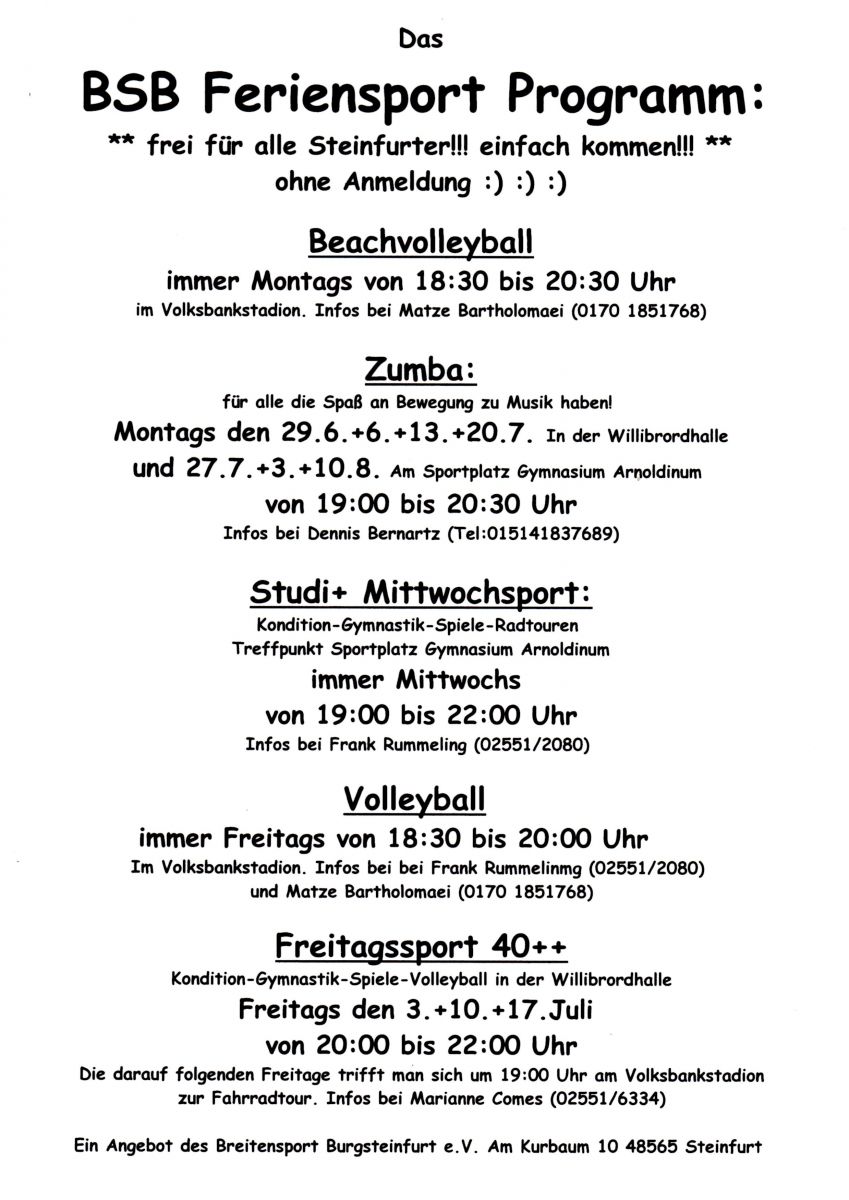 wir bieten euch wieder ein abwechslungsreiches Feriensport Programm, damit ihr fit durch den Sommer kommt. Wie immer sind die Angebote ohne Anmeldung, ohne Beiträge oder andere Kosten und stehen allen Steinfurtern offen. Morgen Abend geht es mit Zumba los.