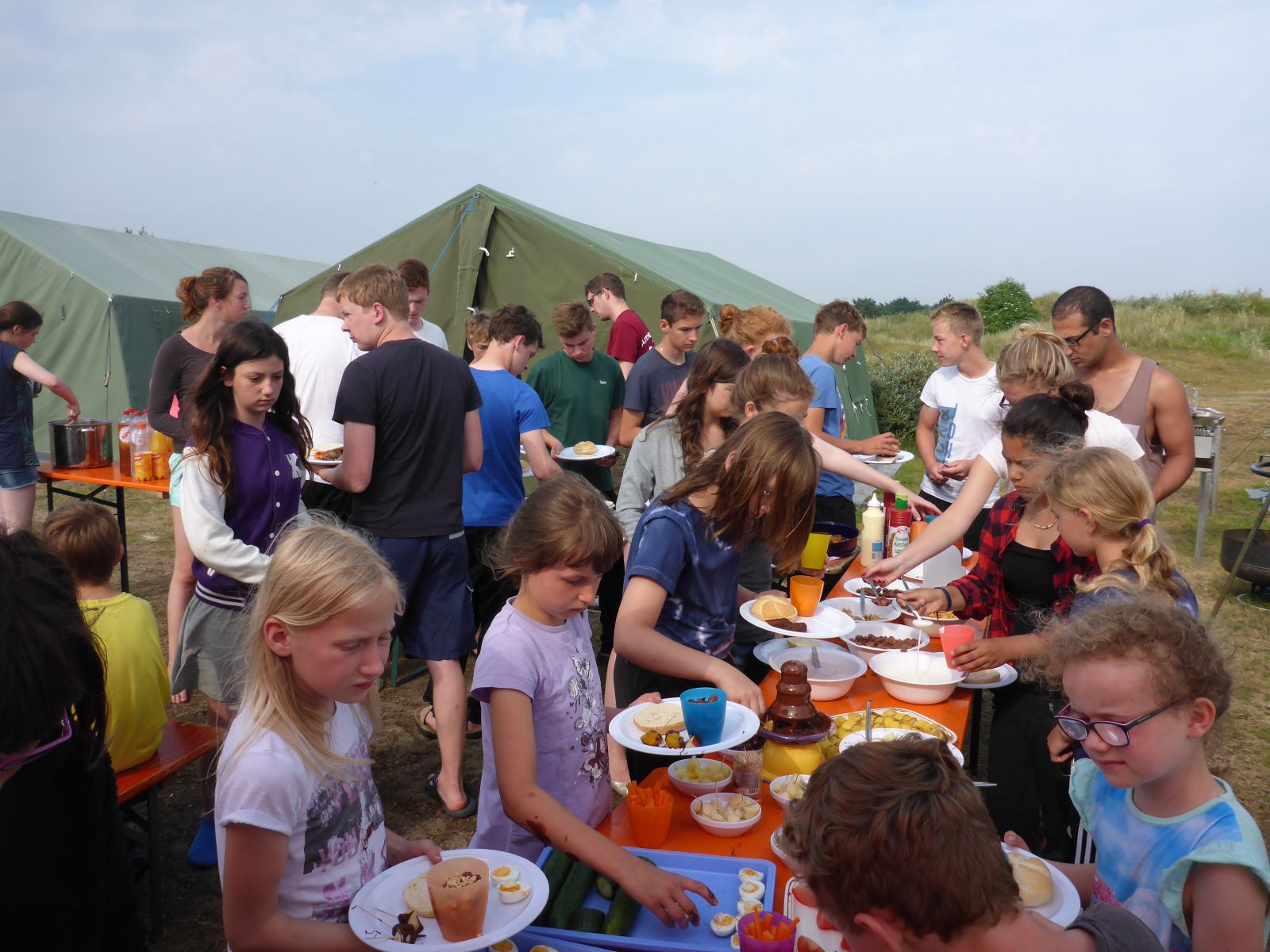 Am Sonntagnachmittag hatte das Wetter dann beschlossen innerhalb von ein paar Minuten mal das Wasser zu verteilen, was sonst eventuell in einem Monat vom Himmel kommt. Obwohl morgens beim großen Buffet alle Leckereien aufgegessen wurden. Da die Kinder am „Chillday“ am Nachmittag dabei waren einen Film zu gucken, konnten die Betreuer sich mit vollem Körpereinsatz den Wassermengen widmen und dafür sorgen, dass alle Zelte zumindest von innen trocken blieben. Das alle Betreuer nachher komplett durchnässt waren, tat der Stimmung keinen Abbruch. Da wurde das Wasser aus den Schuhen gekippt und weiter gemacht. Man war sich sicher, dass das Wetter am nächsten Tag bestimmt wieder besser ist. So kam es dann auch, so dass am nächsten Tag der Rittertag starten konnte. Beim Bogenschießen, Showkampf und dem Basteln von Ritterrüstungen und Schatztruhen konnten nebenher die Regenjacken, T-Shirts, Pullover und Hosen der Betreuer trocknen. Abends gab es dann auch das entsprechende Rittermahl, bei dem mit den Händen ohne Geschirr und Besteck gegessen wurde.