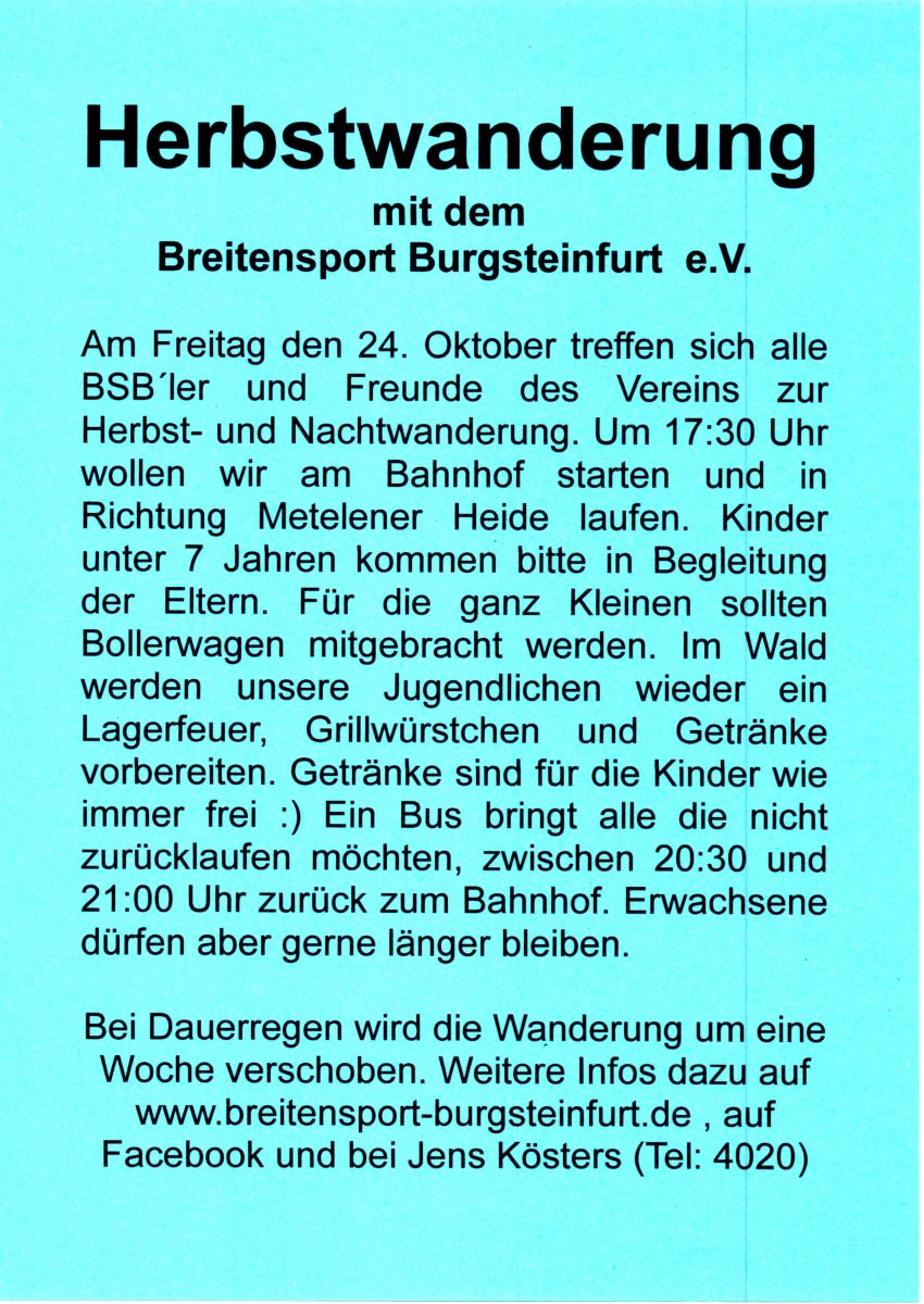 Ob es an dem bisschen Nieselregen gelegen hat, der unpassend zur Startzeit über Burgsteinfurt lag? Es hatten sich deutlich weniger Wanderer als in den Vorjahren zur BSB Herbstwanderung am Bahnhof eingefunden. Dabei war das Wetter gar nicht so schlecht, am Schützenplatz in Sellen auch durchweg trocken.