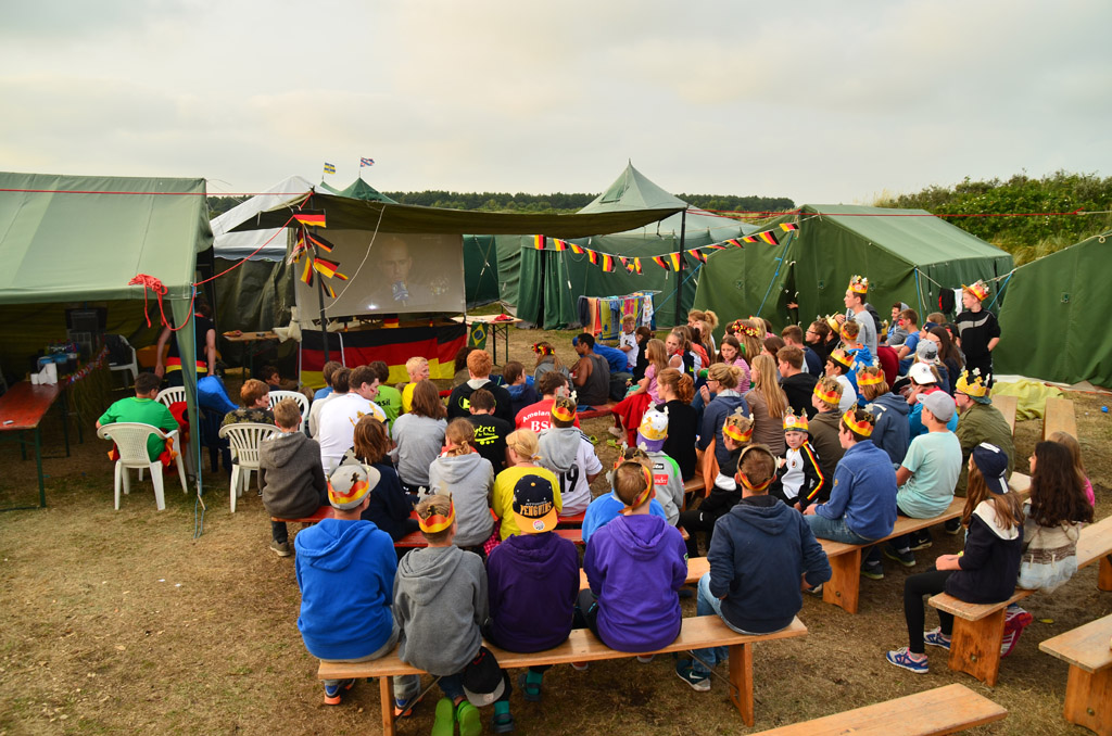 Das am nächsten Tag ein starker Wind aufzog schockierte uns wenig. Wir spielten Fußball um uns schon auf das Deutschlandspiel am Abend vorzubereiten. Die 7:1 Glanzparade der deutschen Mannschaft heizte die Stimmung und das Gemeinschaftszelt noch einmal ganz schön auf. Nach dem Spiel fielen die Kinder und Betreuer nach einem anstrengenden Tag müde ins Zelt. Am heutigen Mittwoch verschob sich dementsprechend das Frühstück auch ein wenig nach hinten. Das nutze das Wetter um wieder etwas freundlicher zu werden. Bei einem Strandspaziergang wurden dann Muscheln gesammelt um damit im Laufe der Woche noch basteln zu können. Am Nachmittag musste dann auch wieder die Sonnencreme ausgepackt werden, um sich bei den kleinen Spielen am Platz nicht einen Sonnenbrand zu holen.