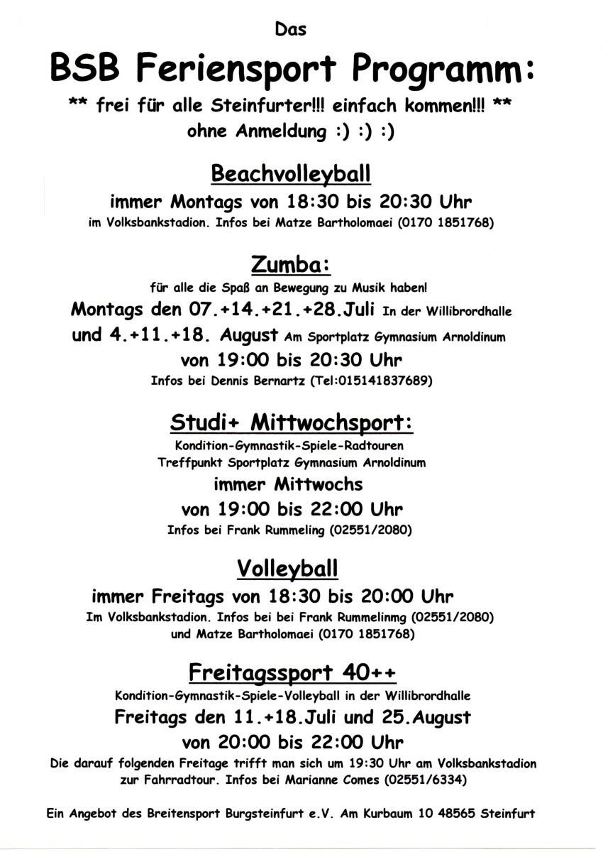 auch in den Sommerferien wollen wir für euch/uns wieder ein paar sportliche Angebote machen. Wie in den letzten Jahren sind die Angebote für alle Steinfurter gedacht. Ohne Anmeldung, ohne Beitrag einfach kommen und Spaß haben!