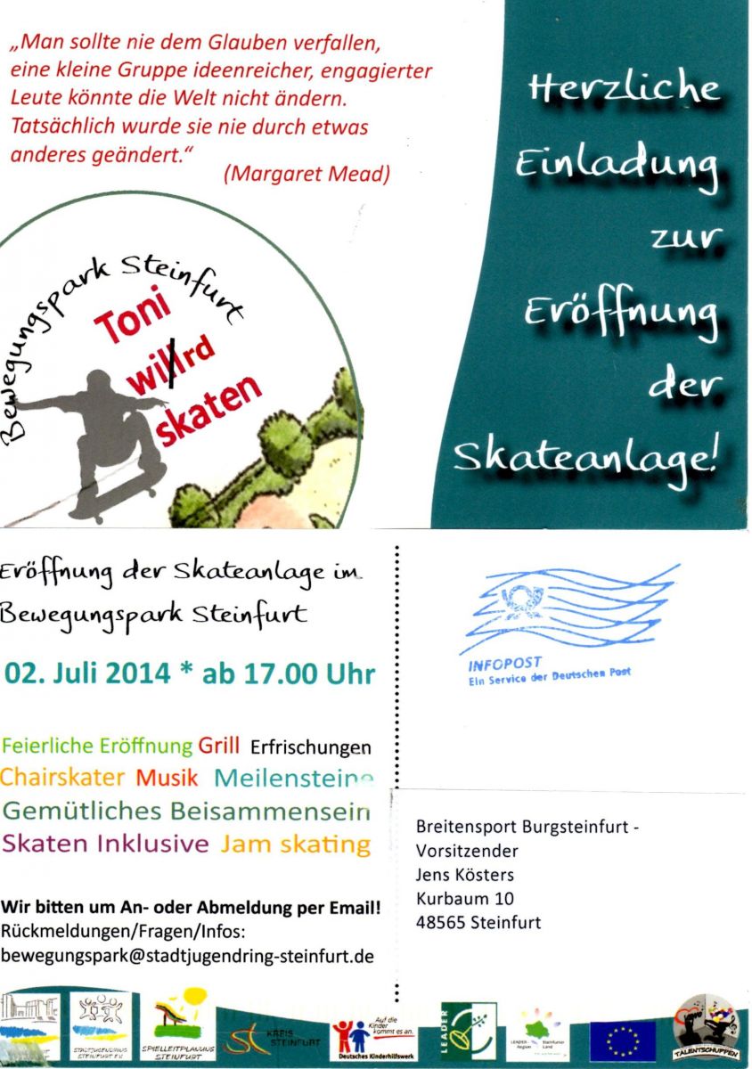 viele von unseren Jugendlichen nutzen ihn schon, den neuen Skaterpark am Stadion gegenüber der Polizei. Morgen wird er offiziell eröffnet. Einige Steinfurter haben sich da mächtig ins Zeug gelegt um das Projekt zu verwirklichen. Vera Menzel und Michael Horstmann vorneweg, aber auch ganz viele weitere haben dazu beigetragen, das für unsere Kinder und Jugendliche ein weiteres sportliches Freizeitangebot geschaffen werden konnte. Auch um deren Arbeit zu würdigen, würde ich mich freuen, wenn ich da morgen Abend nicht nur mit unseren BSB Skatern stehe.