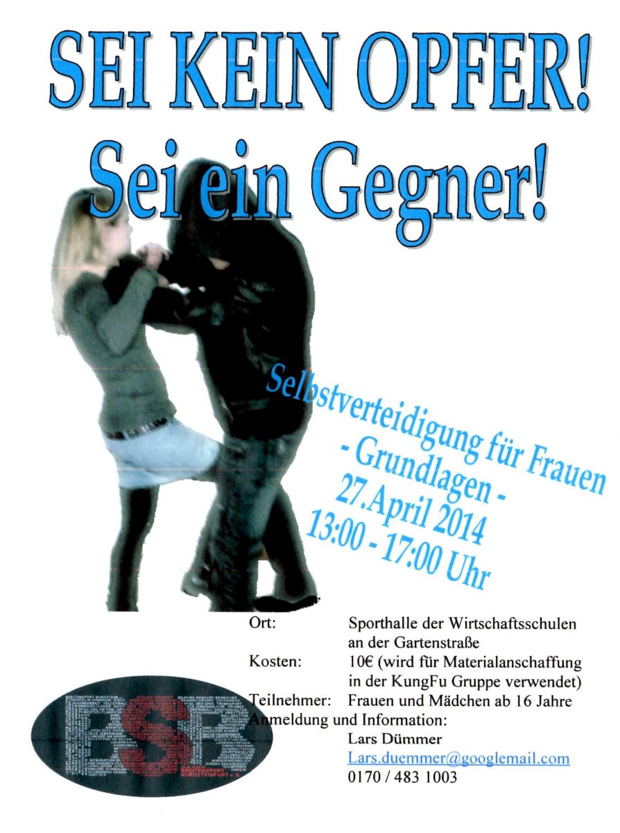 unsere KungFu Gruppe bietet am letzten Sonntag in den Osterferien einen Selbstverteidigungskurs für Frauen an. Mitmachen dürfen auch nicht BSB´ler! Die Anzahl der Plätze ist begrenzt - also schnell bei Lars anmelden. Die 10,- Euro bleiben im Verein, die Schlag (Tritt) Polster die dafür angeschafft werden, könnt ihr an dem Tag gleich ausprobieren! Bequeme Kleidung ist wichtig, eine Kaffeemaschine ist in der Halle, Wasser usw. auch.