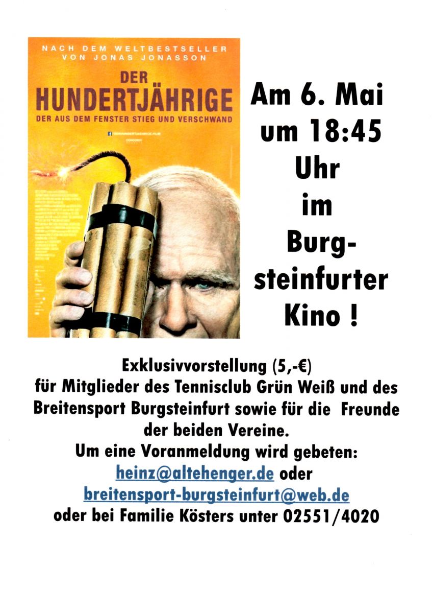 wir wollen wieder ins Kino. Die Boulegruppe, der Tennisclub Grün-Weiß und die 40+ Gruppe wollen sich gemeinsam den Film "Der Hundertjährige.... " an sehen. Auch ihr seid herzlich eingeladen mit uns zu kommen. Alles weitere entnehmt ihr bitte dem Plakat. Die 5€ werden an dem Abend eingesammelt. .jpg)