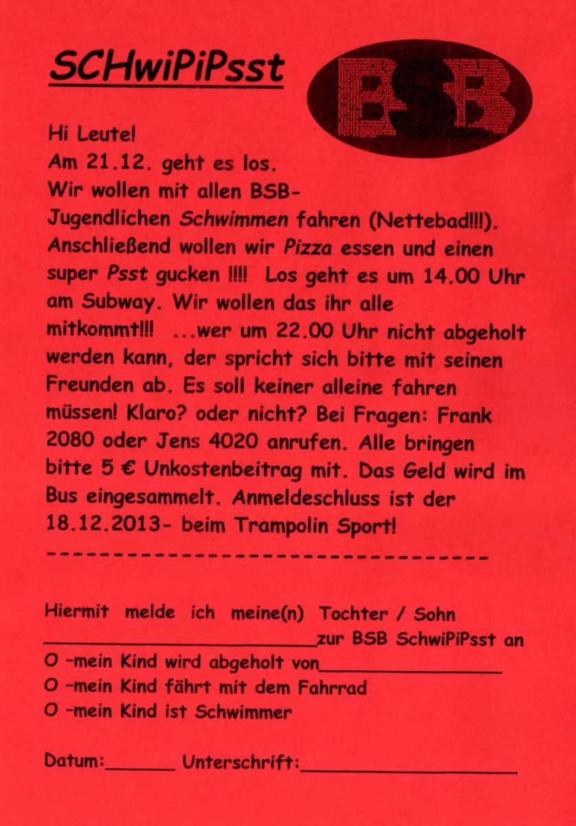 am kommenden Sonntag treffen sich alle die sich im kommenden Jahr im BSB engagieren wollen! Nicht nur der Terminkalender soll durch gegangen werden, auch die Entwicklung des Vereins soll angesprochen werden. Über Anschaffungen und finanzielles muss auch gesprochen werden.