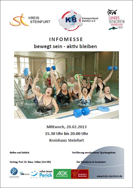 am kommenden Mittwoch findet im Kreishaus die Infomesse "bewegt sein - aktiv bleiben statt". Auch wir stellen uns dort vor! Wer von euch Lust hat sollte mal reinschauen. Der Vortrag von Dr. Klaus Völker (Uni MS) um 18 Uhr ist sicherlich sehr interessant!