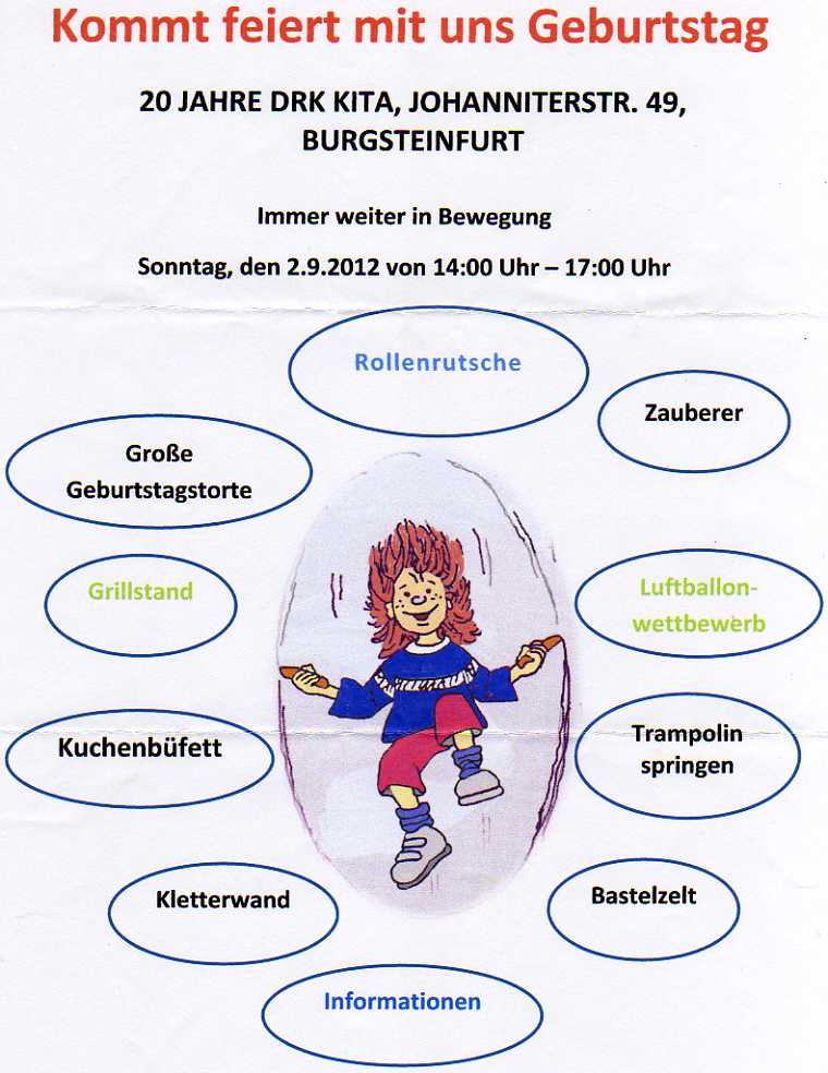 am Sonntag wird Geburtstag gefeiert. Ganz viele von euch kennen ja den Kindergarten an der Johannieterstraße, in dem auch Ulrike arbeitet. Vor nun 20 Jahren ist er eröffnet worden, und da wir von Anfang an immer einen guten Kontakt hatten, immer vieles gemeinsam gemacht haben, sind alle Breitensportler dort eingeladen. Von unserem Übungsleiter und Helfer Team sind ganz viele da und Helfen mit. Es wird dort ganz viele Attraktionen geben - und nicht nur für Kindergartenkinder!