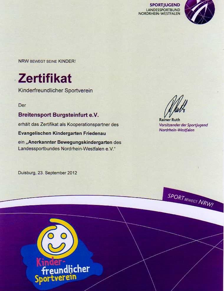 anlässlich des Weltkindertages, der am vergangenem Sonntag in Horstmar gefeiert wurde, ist unser Kooperationskindergarten Friedenau als "Bewegungskindergarten" ausgezeichnet und zertifiziert worden. Daher möchte ich hier Ulla Nimz und ihrem Team ganz herzlich gratulieren! Das komplette Kindergarten Team hat die Ausbildung zum ÜL bei Martina Rathmann (KSB) erfolgreich und mit viiiel Spaß geschafft!