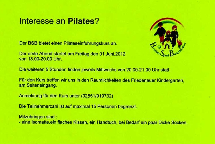 Heike möchte ab morgen mit dem Pilates Anfängerkurs starten. Leider haben sich bis jetzt noch nicht viele angemeldet. Da ich mir aber sicher bin, das das Interesse da ist, und nur durch die vielen Feiertage die Aktion etwas untergegangen ist, möchte ich euch bitten noch einmal Werbung dafür zu machen. Unter 02551/919732 könnt ihr weitere Infos von ihr bekommen.