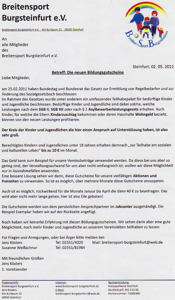 Am Donnerstag sind alle Mitarbeiter zu Mitarbeiterversammlung eingeladen. Thema sind zum Beispiel die neuen Bildungsgutscheine. Hierzu habe ich ein schreiben an alle Mitglieder verfasst, das auch in der Sporthalle aus liegt.