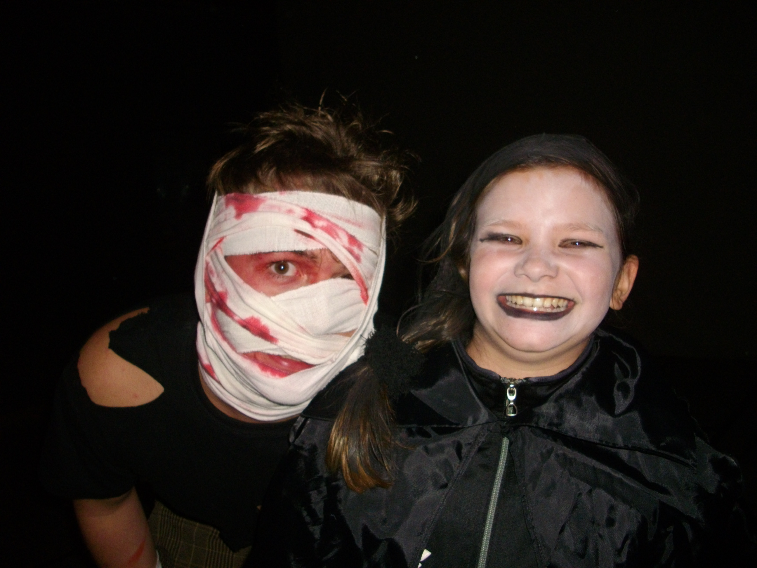 Erst mussten die Kinder durch den Tunnel des Schreckens, bis sie zur gruseligen Abendteuerbahn gelangten. Versteckt lauerten auch dort gruselige Gestalten und der eine oder andere Schrei blieb nicht aus. Darauf wurde Süßes eingesammelt und Saueres verteilt. Ein kleiner Imbiss und noch einen Gruselfilm zum einschlafen, stellte die Kinder sehr zufrieden.