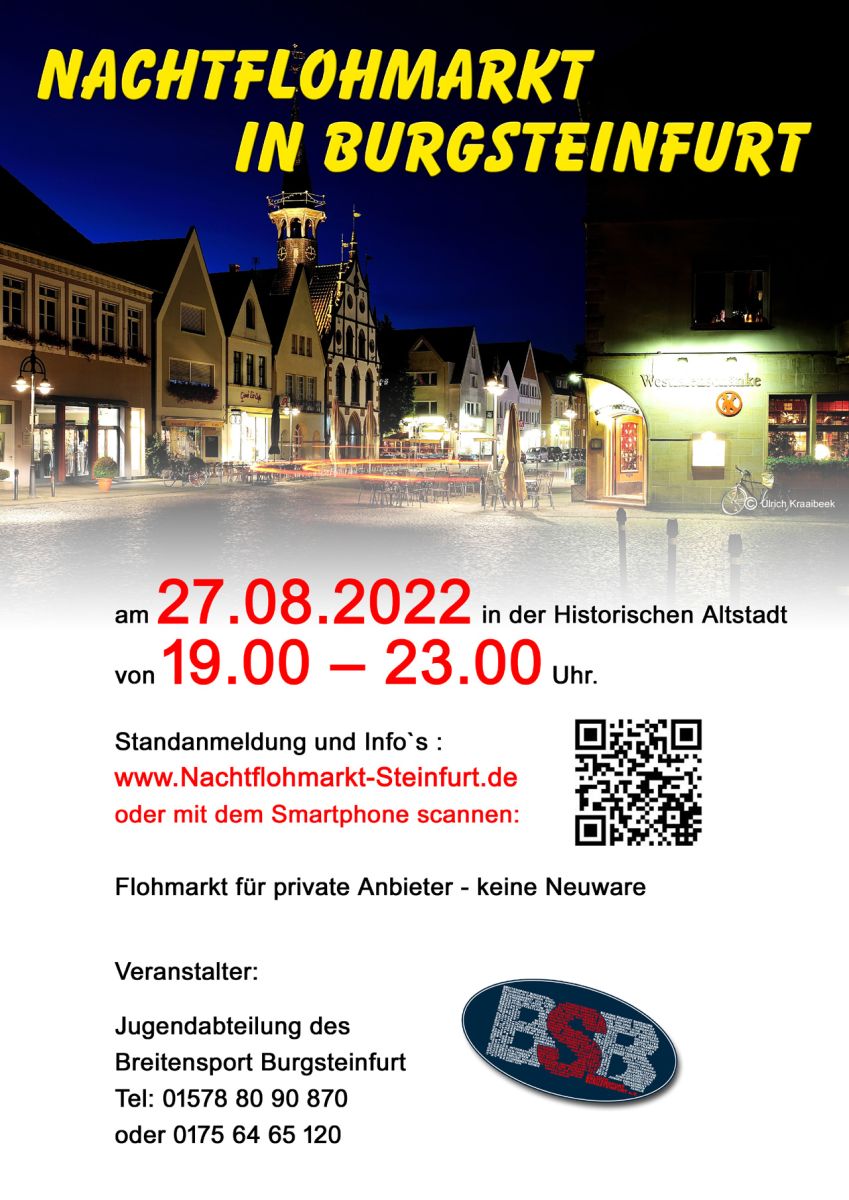 Zwei Jahre mussten wir ihn ausfallen lassen, aber jetzt startet die Jugend des Breitensport Burgsteinfurt am 27.08.2022 endlich wieder einen Nachtflohmarkt in der Historischen Altstadt von Burgsteinfurt.