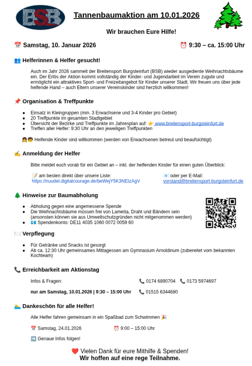 Wie in den vergangenen Jahren führt der Breitensport Burgsteinfurt auch im Jahr 2025 wieder eine Tannenbaumaktion durch. Wie in den vergangenen Jahren treffen sich die Helfer in Kleingruppen an 20 verschiedenen Treffpunkten im ganzen Stadtgebiet. Diese sind hier https://breitensport-burgsteinfurt.de/files/2023_Tannenbaumaktion-2023_Treffpunkte.pdf einzusehen.