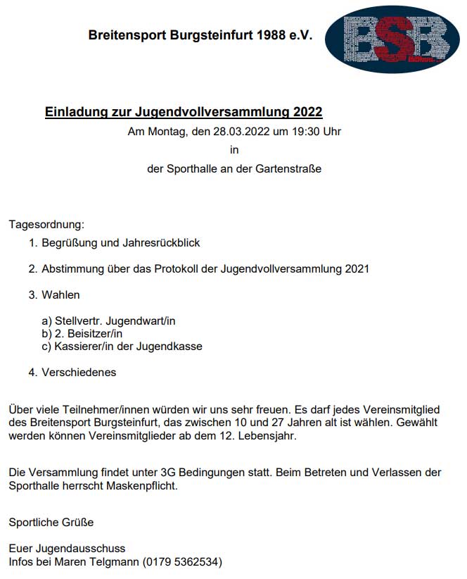die Jugend des Breitensport Burgsteinfurt lädt alle ab 10 Jahren zu unserer Jugendvollversammlung in der Halle Gartenstrasse ein.