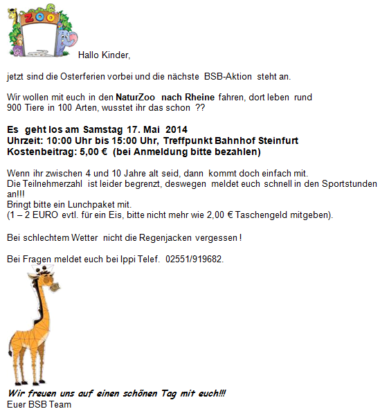 es geht diesen Samstag, den 17.5.2014 in den Zoo nach Rheine und wir haben noch ein paar Plätze frei.