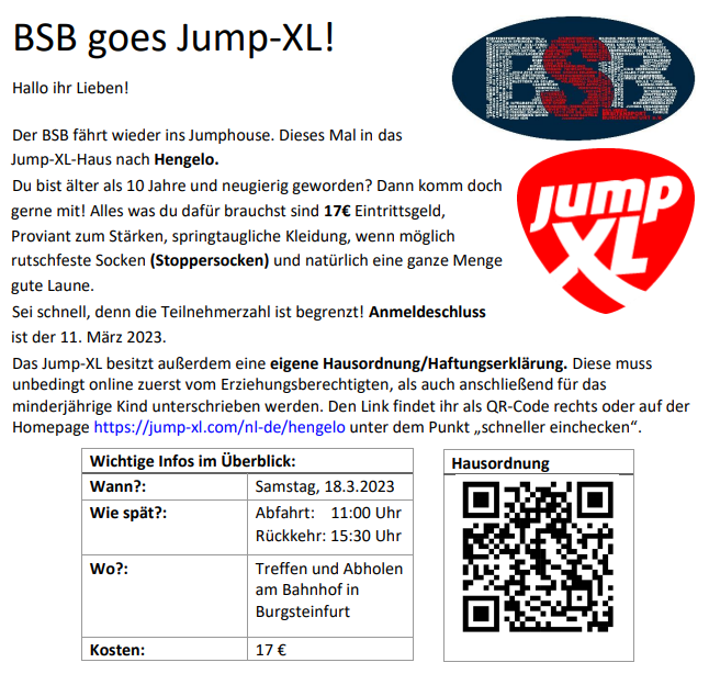 Genauere Informationen und die Anmeldung dazu findet unter https://www.breitensport-burgsteinfurt.de/Jahresplan/2023/Fahrt-ins-Jumphouse.html