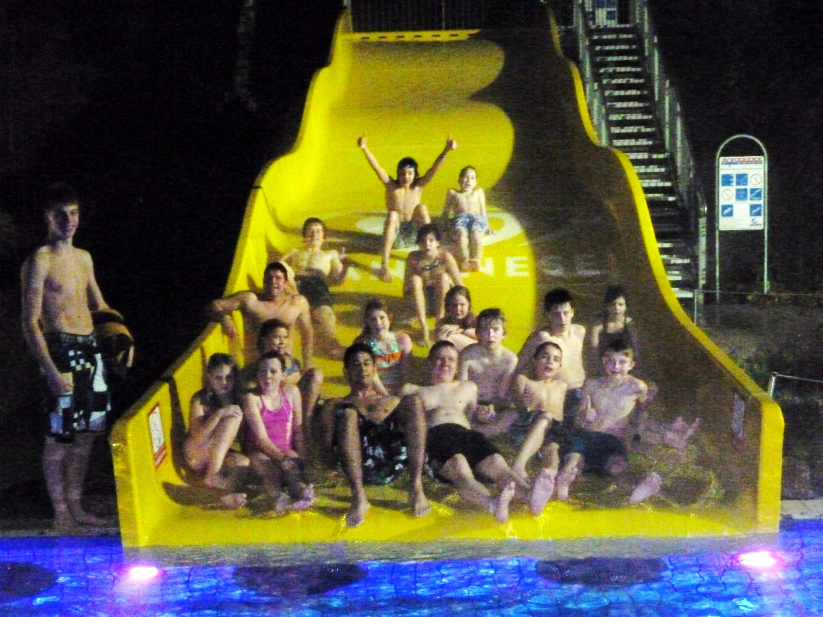 Beliebt war auch die Außenrutsche. Hier war "Langsamrutschen" angesagt. Bei Temperaturen nahe Null und Regen, waren aber alle froh wenn sie wieder ins warme Wasser eintauchen durften.
